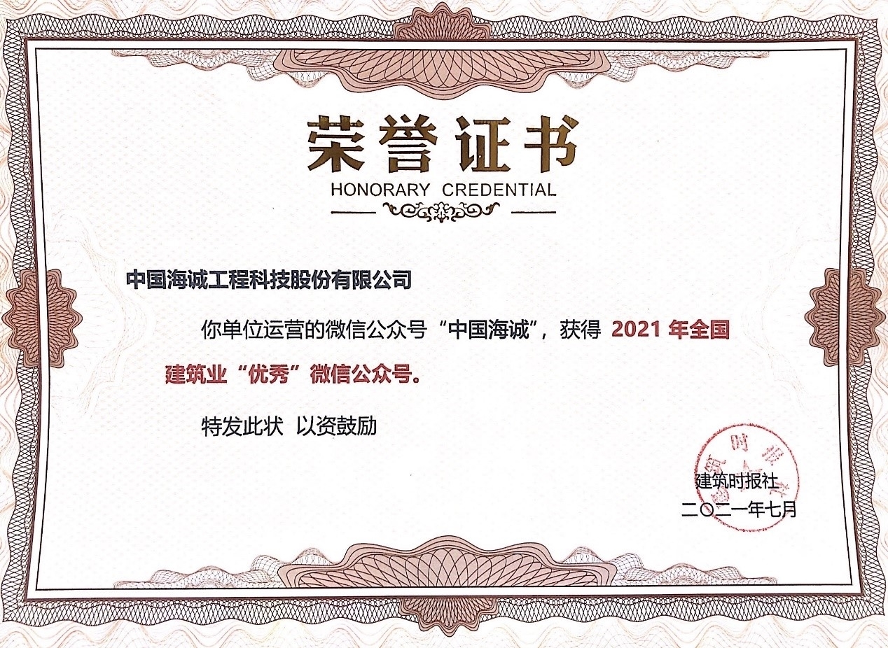 On July 16, the 2021 Construction Industry WeChat Official Account Operation and Maintenance Experience Exchange Seminar & the National Construction Industry Outstanding Official Account Award Ceremony hosted by the Construction Times was held in Yangzhou. China Haisum's official WeChat public account was awarded the "2021 National Excellent WeChat Public Account in the Construction Industry". This marks the winning of such honor for the second consecutive year.