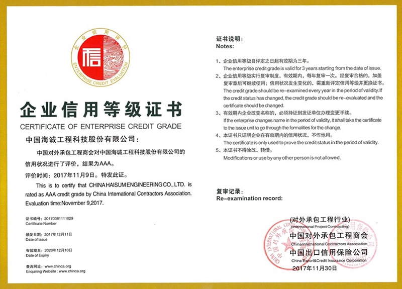 近日,在中國對外承包工程商會和中國出口信用保險公司聯(lián)合舉辦的2017年度對外承包工程企業(yè)信用等級評價中,公司又一次獲得“aaa級信用企業(yè)”稱號。
