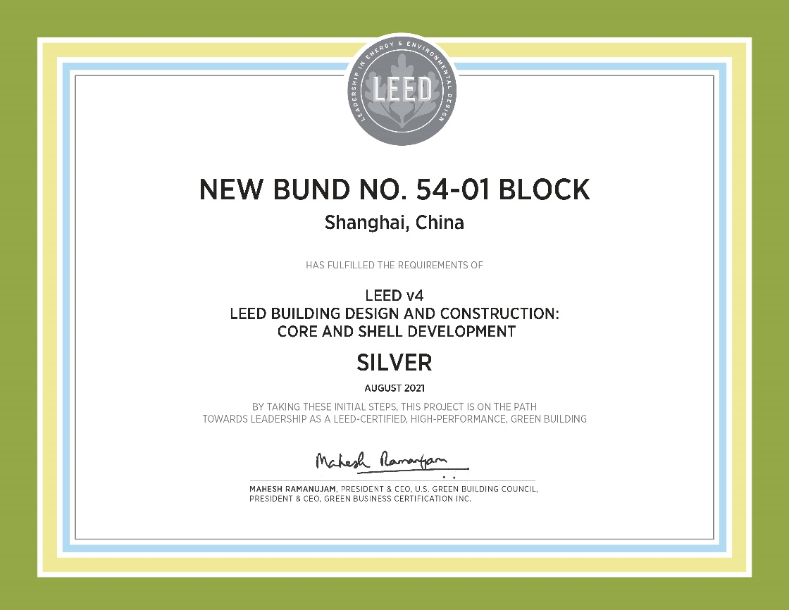 日前,由海誠(chéng)股份所屬中國(guó)輕工業(yè)上海工程咨詢(xún)有限公司擔(dān)任綠建咨詢(xún)顧問(wèn)的“前灘54-01地塊” 項(xiàng)目獲得LEED銀級(jí)預(yù)認(rèn)證。
