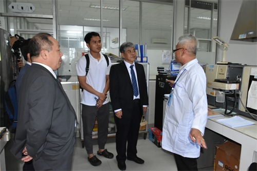 曹春昱一行首先來到柬埔寨國家科學(xué)技術(shù)創(chuàng)新實驗室(STINL),參觀水化學(xué)檢測室、重金屬元素分析室、果汁及啤酒中試車間等實驗室場所,詳細(xì)了解“一帶一路”聯(lián)合實驗室運行情況及此前中方援助設(shè)備使用情況。